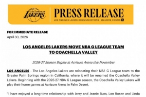 官宣!湖人下属球队将搬迁至科切拉谷 并更名为科切拉谷湖人